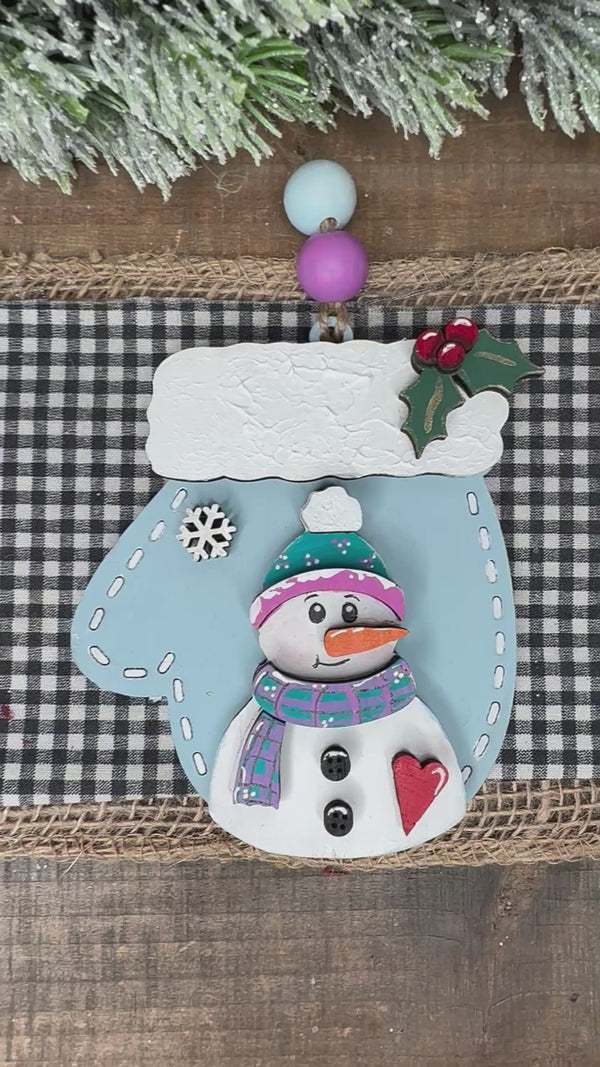 Eek...Add some whimsy to winter season bags or your Seasonal Trees with our Snowman in Mitten Ornament Handcrafted from wood, this 4.5" ornament features multi layered: Snowman, nose, scarf, berries,heart, snowflake