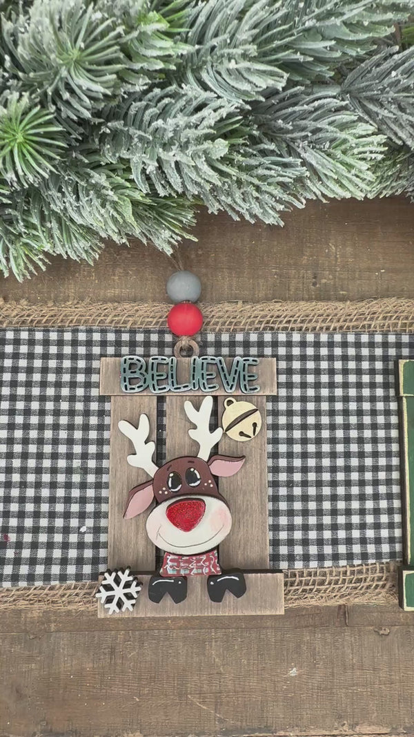 Eek...Add some whimsy to winter season bags or your Seasonal Trees with our Believe Rudolph Palette Ornament Handcrafted from wood, this ornament features multi layered: palette ornament, rudolph, nose, scarf, snowflake, jingle bell and the word believe.